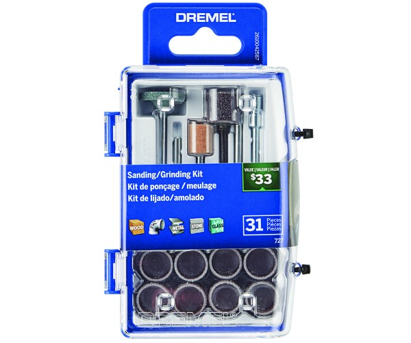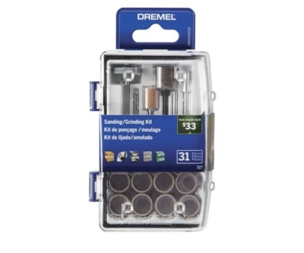 El kit consta de piedras de pulido de óxido de aluminio, piedras de pulido de carburo de silicio, disco de corte reforzado con fibra de vidrio, discos de lijado, tambor de lijado, bandas de lijado, pulido abrasivo de acabado EZ Lock y mandril.