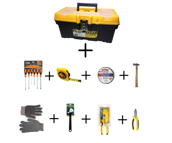 INCLUYE: JUEGO DE DESTORNILLADORES TRAMONTINA 44127/406, MARTILLO BOLITA FMTBM226, CINTA METRICA DE 5 METROS EVEL, CINTA AISLADORA DE 18MMX20, GUANTE MOTEADO 1100FERCI, PINZA UNIVERSAL DE 6" LLAVE AJUSTABLE DE 10" ALICATE OBLICUO DE 6"
