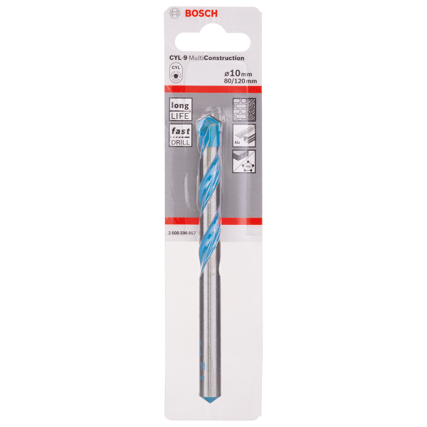 BROCA MULTICONSTRUCTION Para usar con todos los taladros. Longitud: útil: 80 mm. total: 120 mm. Ø 10 mm. Brocas multiuso con encastre cilíndrico. Perfectas para perforar: madera. metal. azulejo. ho rmigón. plástico y materiales mixtos. Unidad de embalaje: 1