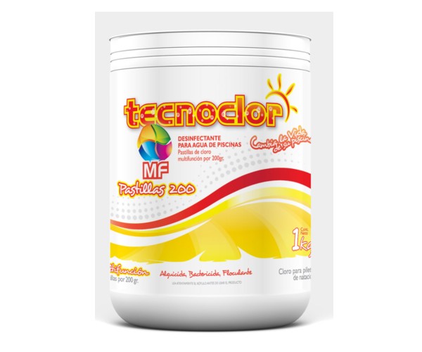 Tecnoclor® tabletas de 200 grs Pastilla multifunción alguicida-bactericida, floculante y fungicida Propiedades Producto para el tratamiento integral de piscinas con aguas muy duras o difíciles. Asimismo, es muy recomendable para el tratamiento de efluentes.