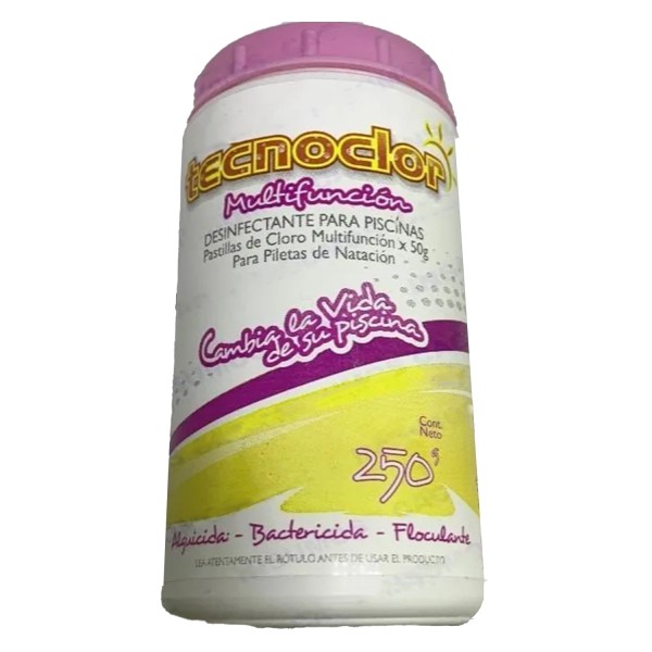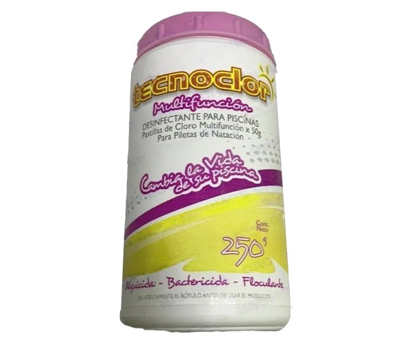 Componentes activos Mezcla de ácido tricloro 1,3,5 triazina-triona, sales inorgánicas y un fungicida. Aspecto Tabletas cilíndricas. Peso de la tableta Aproximadamente 200 g. Medidas de la tableta Cilindro de aproximadamente 8 cm de diámetro por 2.6 cm de altura. Olor Característico, a cloro. Color Blanco, con pintas azules. pH de la solución acuosa al 1% 3 a 3.5 Modo de empleo y dosis Después de lavar el filtro, colocar dos tabletas de Tecnoclor® tabletas en los skimmers por cada 50.000 litros de agua, reponiendo cada vez que sea necesario. Importante - No utilizar con filtros de diatomeas. - En caso de usarse permanentemente, vigilar la floculación y el alguicida. - En aguas muy duras, reforzar el tratamiento de arranque o choque con Tecnoclor® Cloro granulado al 60 % disolución rápida, agregando 100 g cada dos días, por cada 50.000 litros de agua. - Mantener el cloro libre entre 1.2 y 1.5 ppm. Después de lluvias, elevar la concentración hasta 2 ppm. - El pH de la piscina debe mantenerse siempre entre 7.2 y 7.6. Presentación Envases por 1, 5, 20 y 50 kg P.A.M.S. Nº 24117