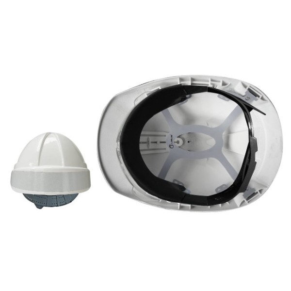 Banda frontal en tela sintética perforada para absorción de transpiración (sudadera); es desmontable, lavable y puede ser reemplazada por un repuesto.