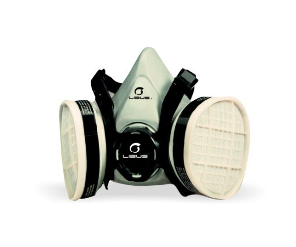 Máscara respiratoria que cubre nariz y boca. Reutilizable y de bajo mantenimiento. Puede trabajar con filtros de partículas o cartuchos quimicos recambiables.